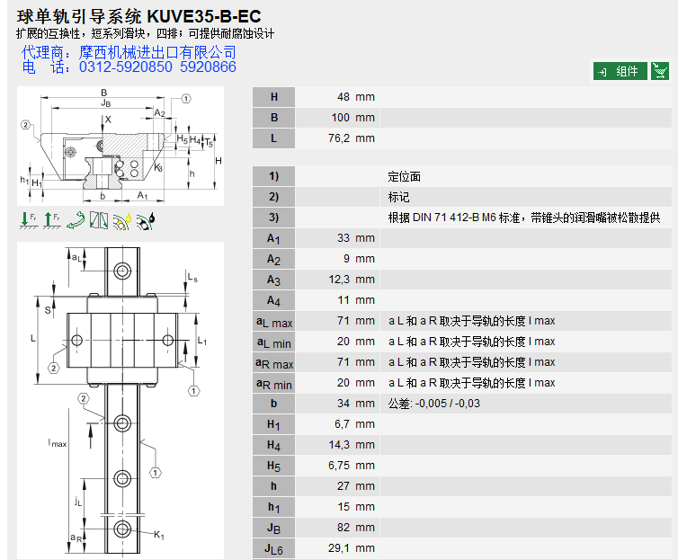 德国INA的球单轨INA KUVE35-B-EC INA KUVE35BEC系产品INA轴承、INA直线导轨、INA滑块。舍弗勒集团一直定位于高端产品的研发,INA产品始终处于业内领先地位,被广泛应用于:机床、印刷、包装、木工机械、立体装卸、起重机械、医药机械、拉伸机械、机器人、雕刻机械、装配机械、切割机械、等众多领域。 INA公司自1975年开始进入直线运动领域,INA制定了多种系列的产品,解决了在机械设计和制造等领域的问题。其主要产品有:INA直线导轨、INA滑块、INA直线轴承、INA伸缩导轨、INA抽屉式导向件、INA线性元件、INA线性滑轨、INA重负荷导向件、INA重负荷导轨等。