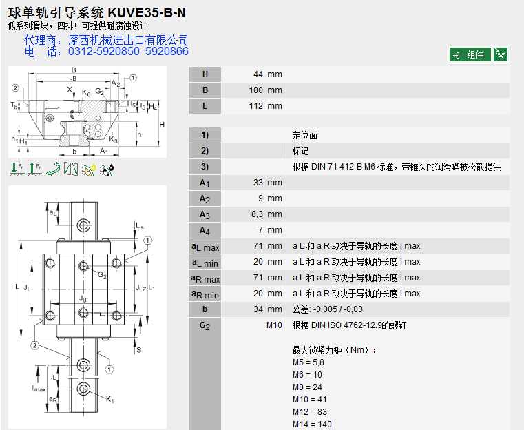 德国INA的球单轨INA KUVE35-B-N INA KUVE35BN系产品INA轴承、INA直线导轨、INA滑块。舍弗勒集团一直定位于高端产品的研发,INA产品始终处于业内领先地位,被广泛应用于:机床、印刷、包装、木工机械、立体装卸、起重机械、医药机械、拉伸机械、机器人、雕刻机械、装配机械、切割机械、等众多领域。 INA公司自1975年开始进入直线运动领域,INA制定了多种系列的产品,解决了在机械设计和制造等领域的问题。其主要产品有:INA直线导轨、INA滑块、INA直线轴承、INA伸缩导轨、INA抽屉式导向件、INA线性元件、INA线性滑轨、INA重负荷导向件、INA重负荷导轨等。
