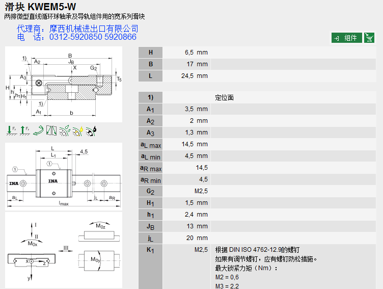 德国INA的球单轨INA KWEM5-W系产品INA轴承、INA直线导轨、INA滑块。舍弗勒集团一直定位于高端产品的研发,INA产品始终处于业内领先地位,被广泛应用于:机床、印刷、包装、木工机械、立体装卸、起重机械、医药机械、拉伸机械、机器人、雕刻机械、装配机械、切割机械、等众多领域。 INA公司自1975年开始进入直线运动领域,INA制定了多种系列的产品,解决了在机械设计和制造等领域的问题。其主要产品有:INA直线导轨、INA滑块、INA直线轴承、INA伸缩导轨、INA抽屉式导向件、INA线性元件、INA线性滑轨、INA重负荷导向件、INA重负荷导轨等。
