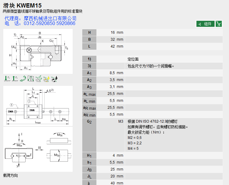 德国INA的球单轨INA KWEM15系产品INA轴承、INA直线导轨、INA滑块。舍弗勒集团一直定位于高端产品的研发,INA产品始终处于业内领先地位,被广泛应用于:机床、印刷、包装、木工机械、立体装卸、起重机械、医药机械、拉伸机械、机器人、雕刻机械、装配机械、切割机械、等众多领域。 INA公司自1975年开始进入直线运动领域,INA制定了多种系列的产品,解决了在机械设计和制造等领域的问题。其主要产品有:INA直线导轨、INA滑块、INA直线轴承、INA伸缩导轨、INA抽屉式导向件、INA线性元件、INA线性滑轨、INA重负荷导向件、INA重负荷导轨等。